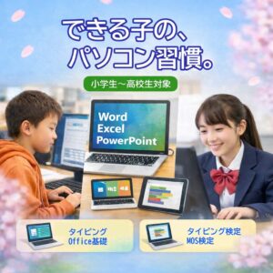 小・中・高校生対応 できる子の、パソコン習慣。 はなまるパソコン教室では、小学生から高校生までを対象に、 テキスト学習を中心としたパソコン講座を行っています。 タイピングやWord・ExcelなどのOfficeを、基礎か […]