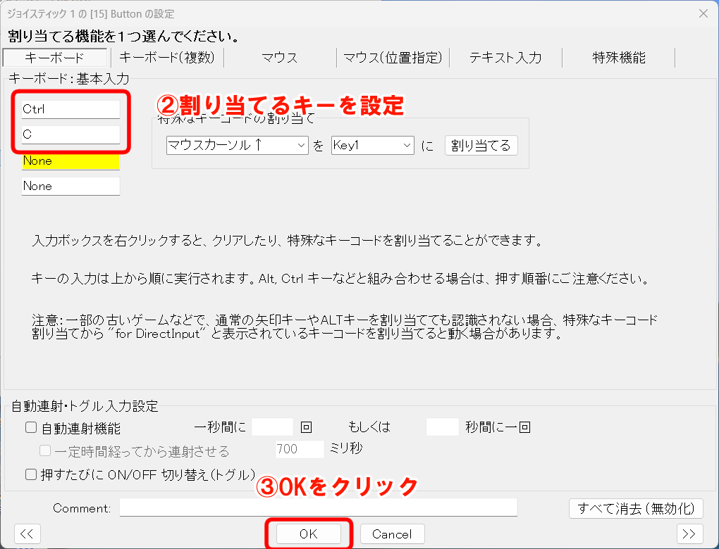 3. 割り当てたいキーやショートカット(例:矢印キー・Enter・PageDownなど)を設定して「OK」。
