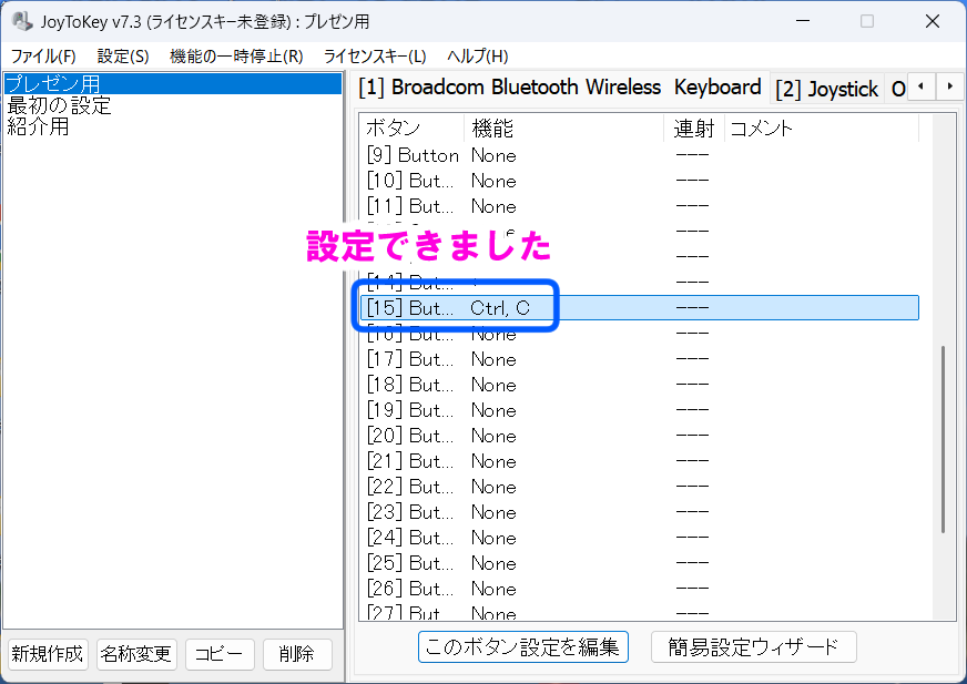 そこで今回は、JoyToKey というアプリを使って、TABMATEのボタンにショートカットを割り当ててみました。