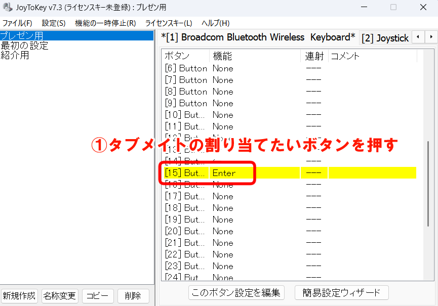 2. JoyToKeyを起動し、TABMATEのボタンを押すと、アプリ内で該当するボタンが黄色く表示されます。該当するボタンをクリック → 「このボタンを編集」を選択。