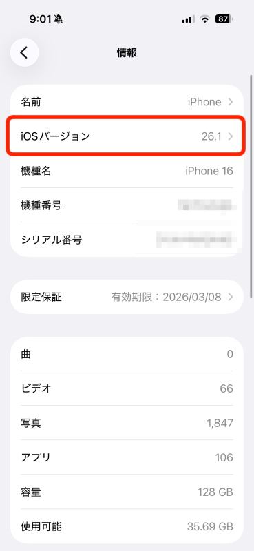 4.バージョンを確認。iOSが15以上であれば大丈夫です。iOSが15未満の場合はOSアップデートをする必要があります。