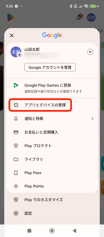 3.「アプリとデバイスの管理」をタップ